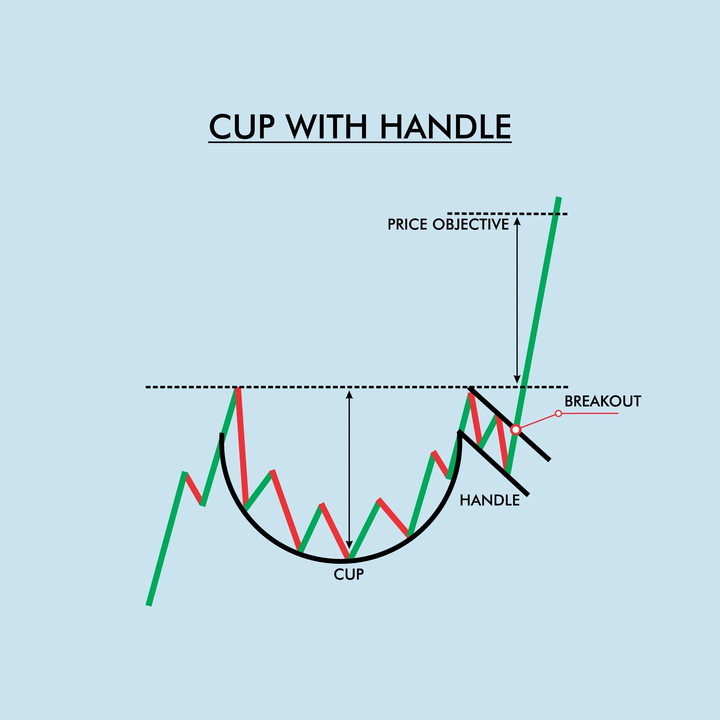 ☕ The Cup: A wide, smooth, U-shaped rounding bottom. The price drops from a high, flattens out at the bottom for an extended period, and then slowly rises back to the previous high. It should not be a sharp "V" shape.