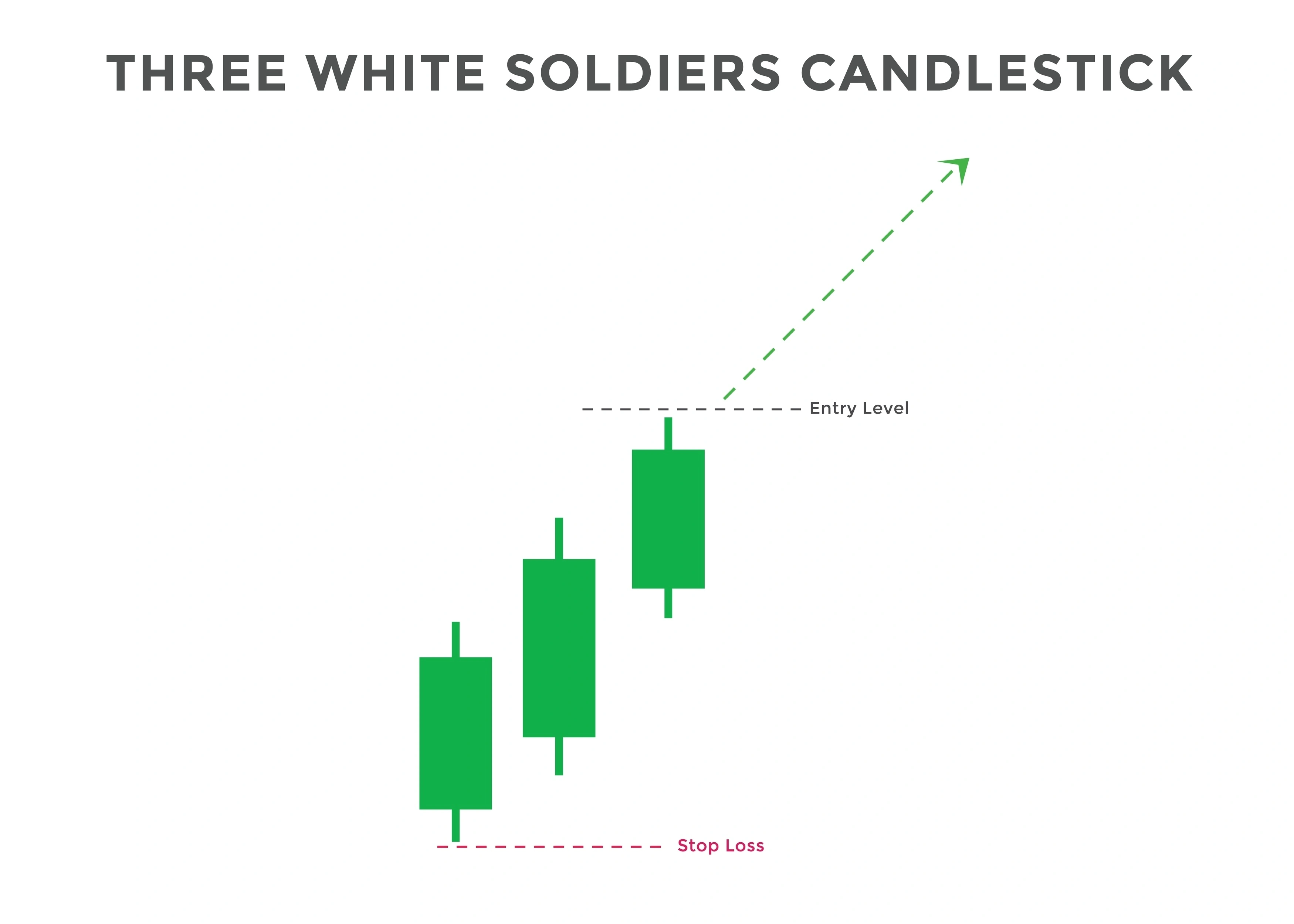 The Three White Soldiers is a bullish reversal (and sometimes continuation) pattern that unfolds over three consecutive trading sessions. It is characterized by three long, strong green candles marching upward.